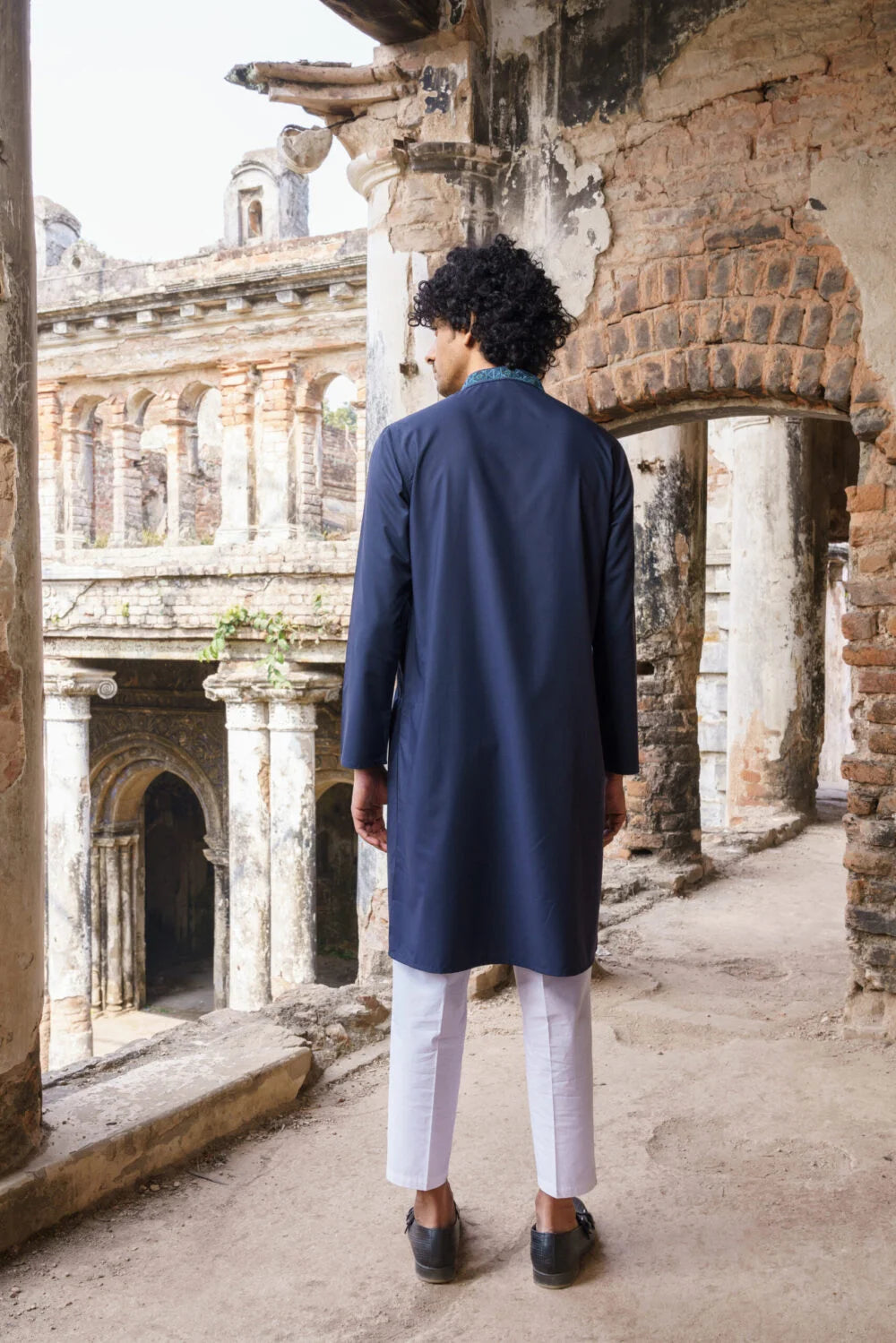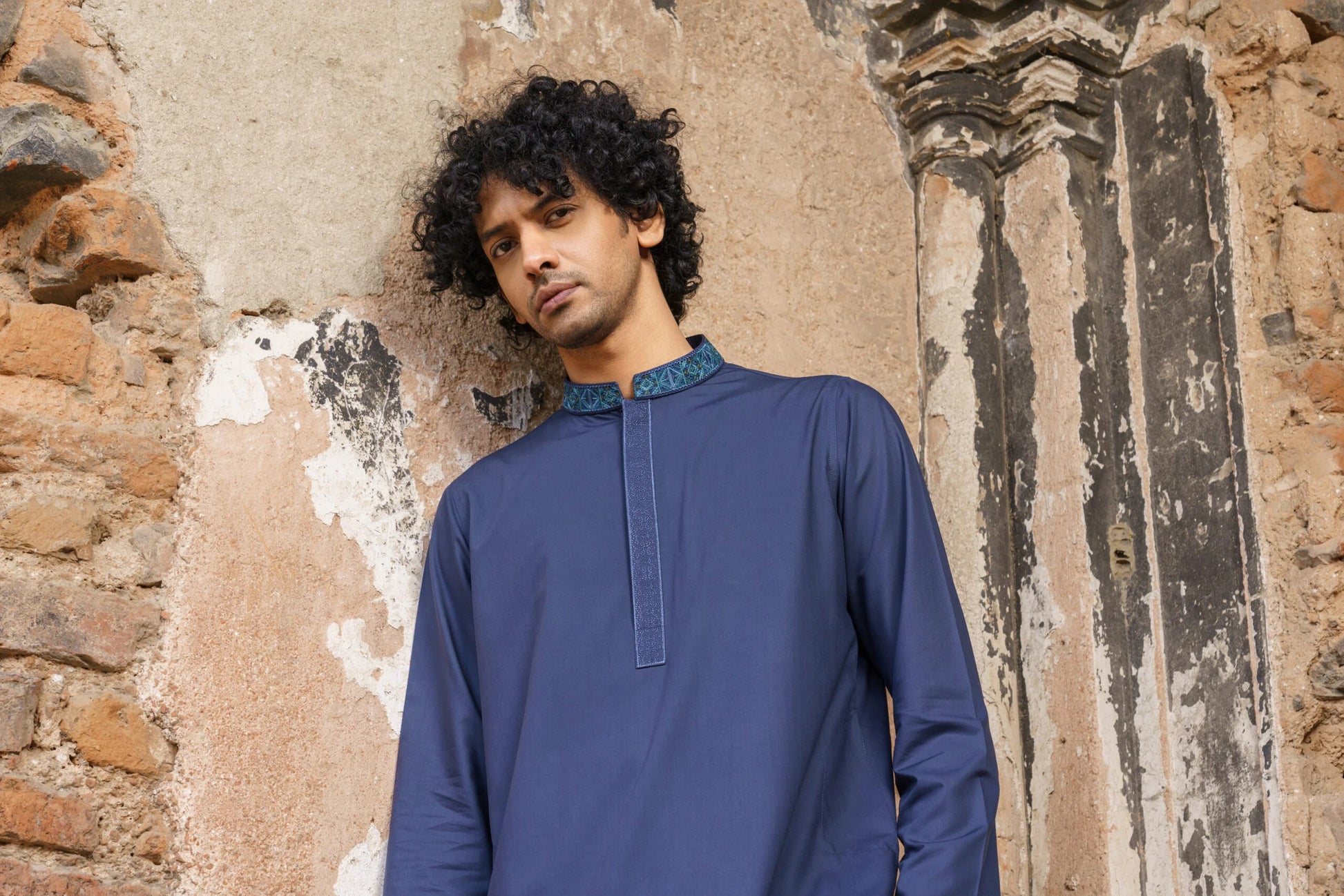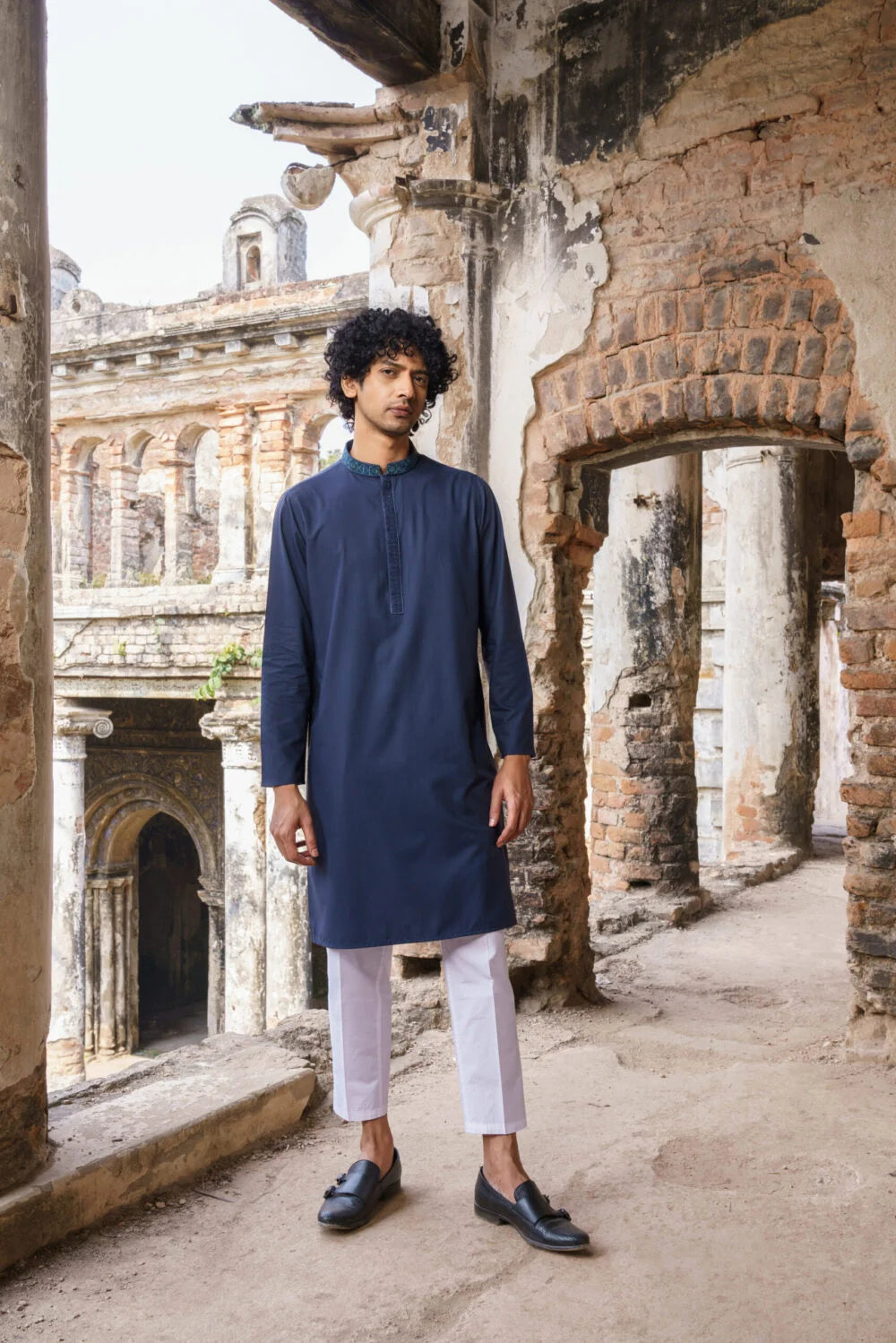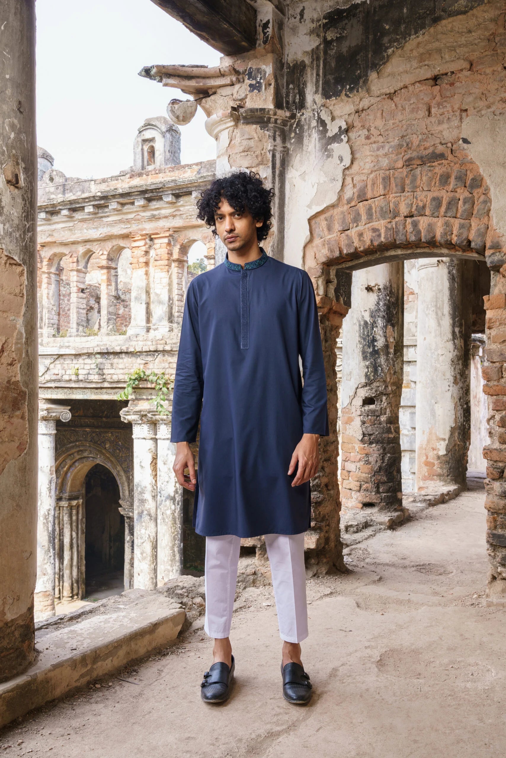 Embroidered Collar, Embroidered hidden Placket with Plastic Button, Narrow Sleeve