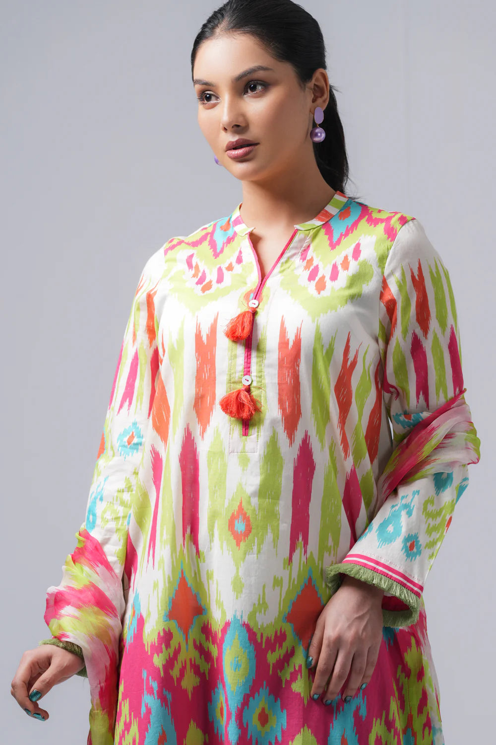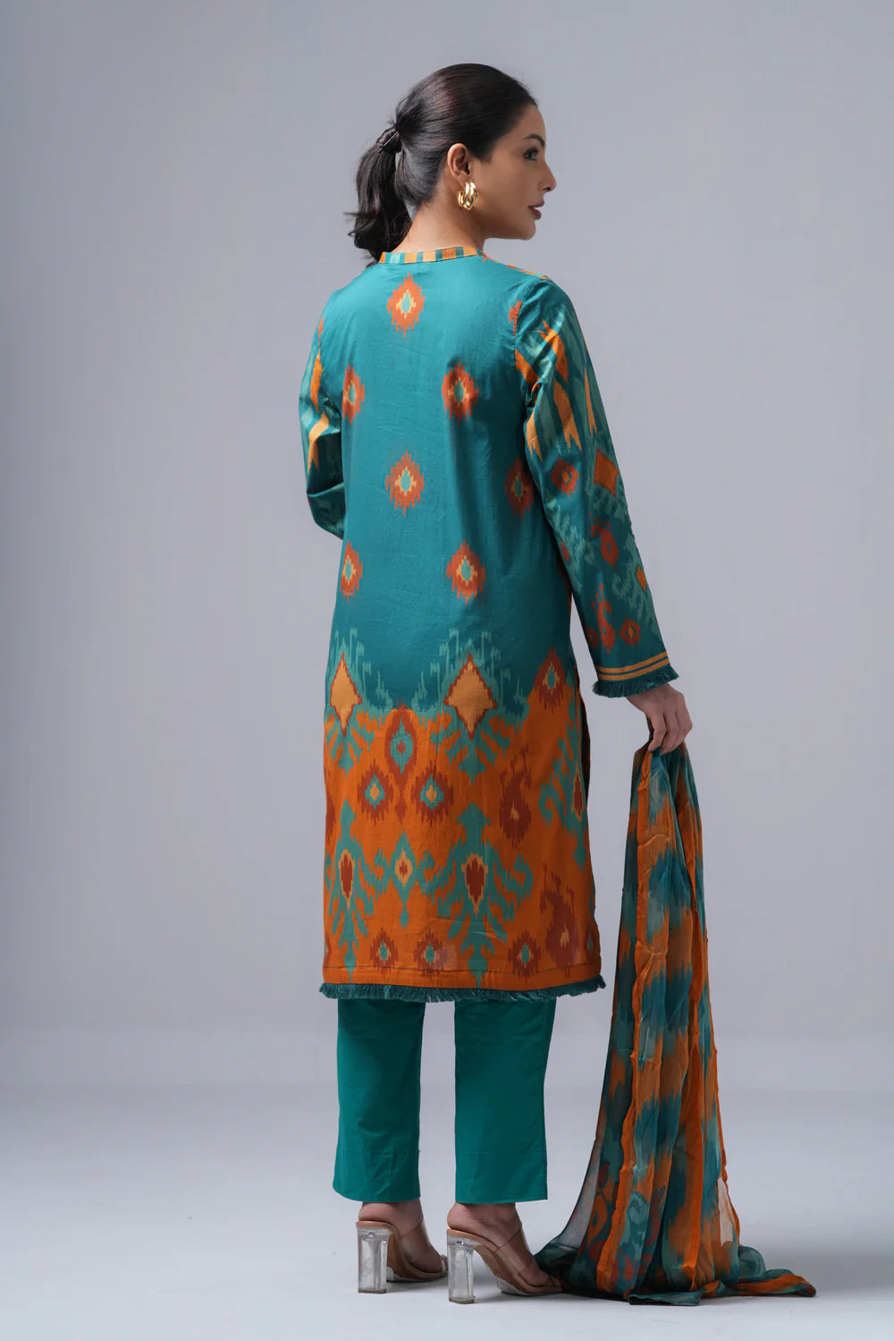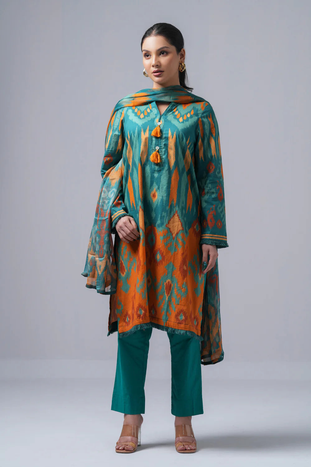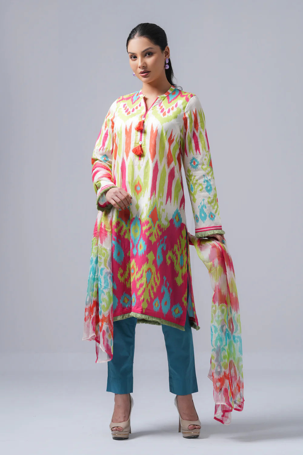 Elevate your everyday style with our ready-to-wear 2-piece lawn suit, featuring a beautifully printed lawn kameez with a flattering V-neck, contrast piping, and embellishments with shell buttons and fringe lace for added charm. Paired with a soft, flowing chiffon dupatta, this ensemble offers the perfect blend of comfort and elegance ideal for casual outings or effortlessly refined daywear.