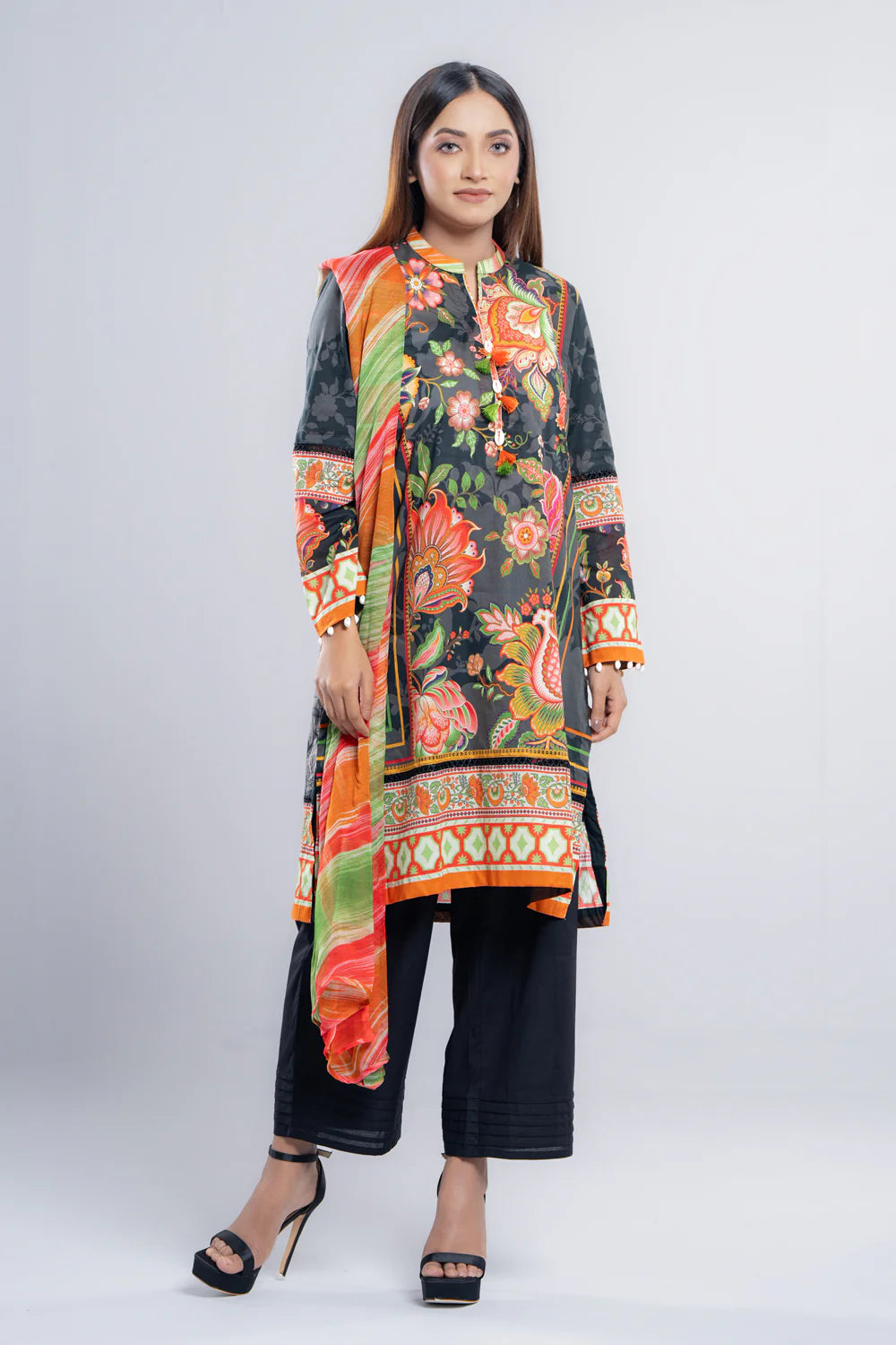 Elevate your elegance with our stunning ready-to-wear 3 Piece Lawn Salwar Kameez Suit with chiffon dupatta and solid dyed relaxed pant embellished with decorative lace, cowrie shells, tassels and contrast detailing that exudes elegance and sophistication, perfect for special occasions or adds luxury to your everyday wardrobe.