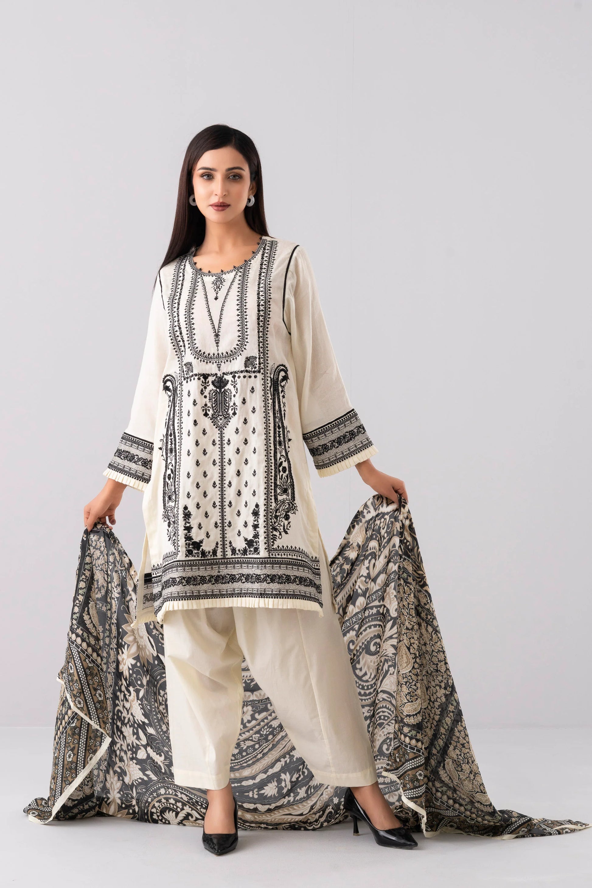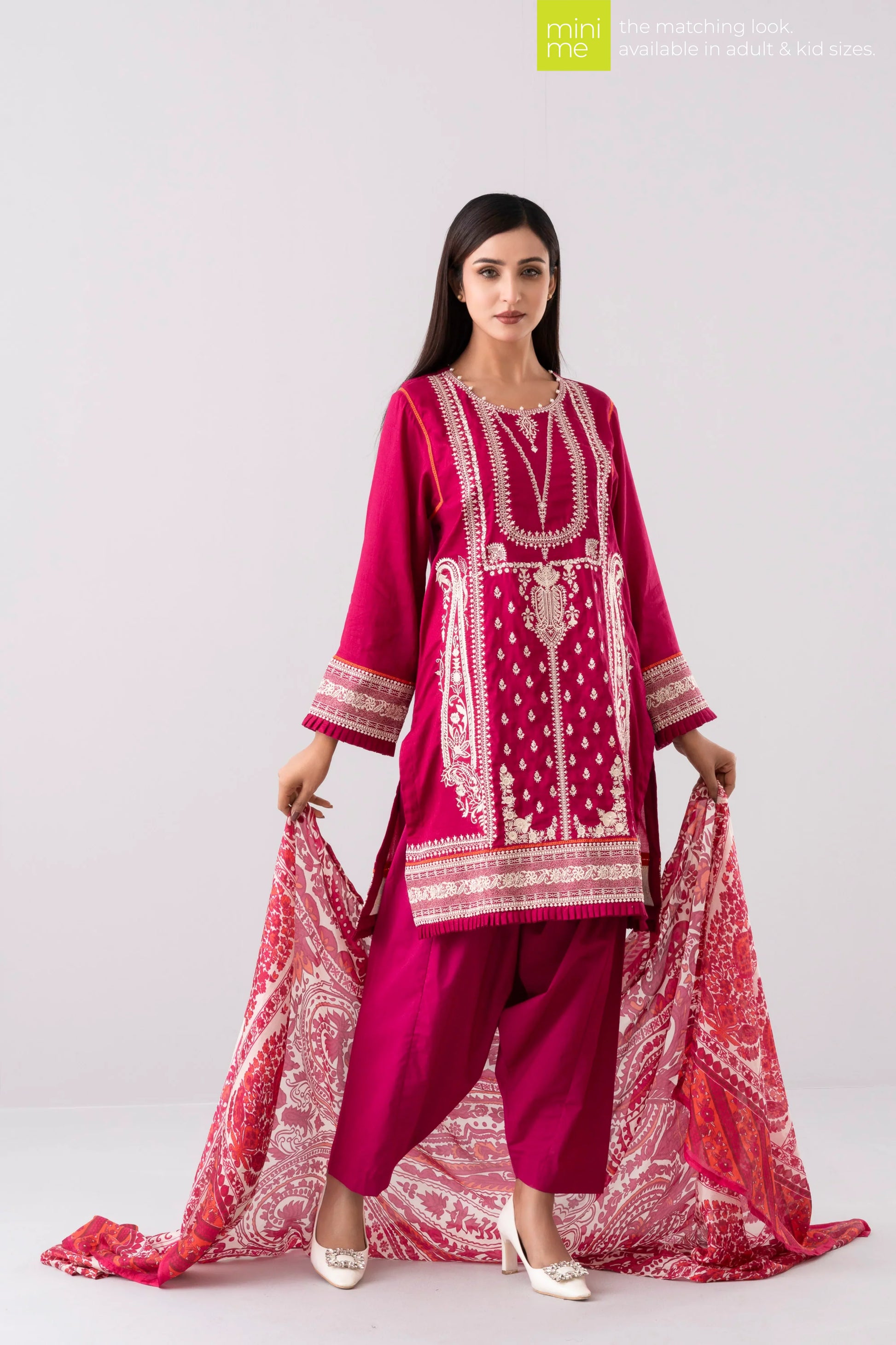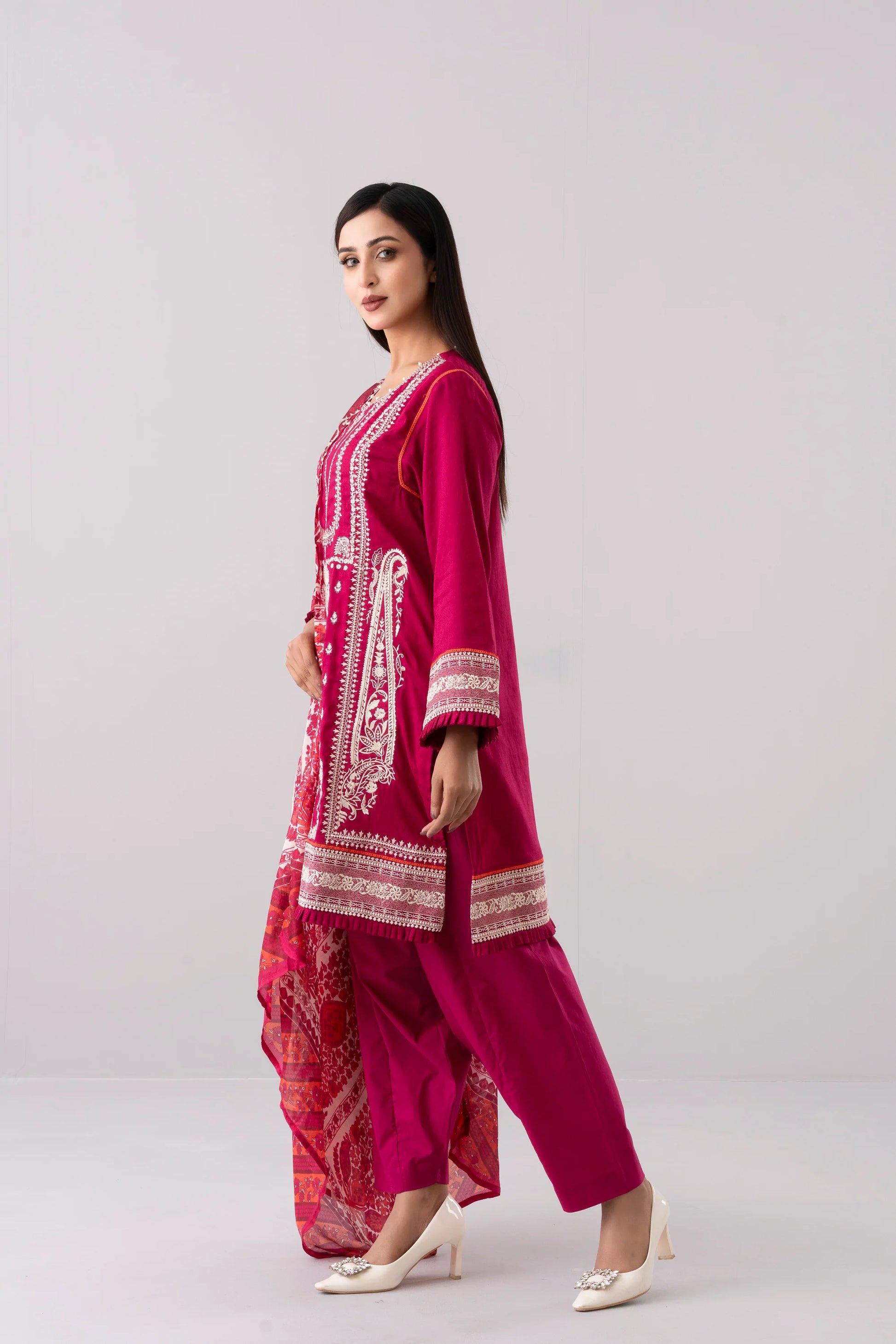Relaxed Fit Embroidered Three-Piece Lawn with Silk Dupatta