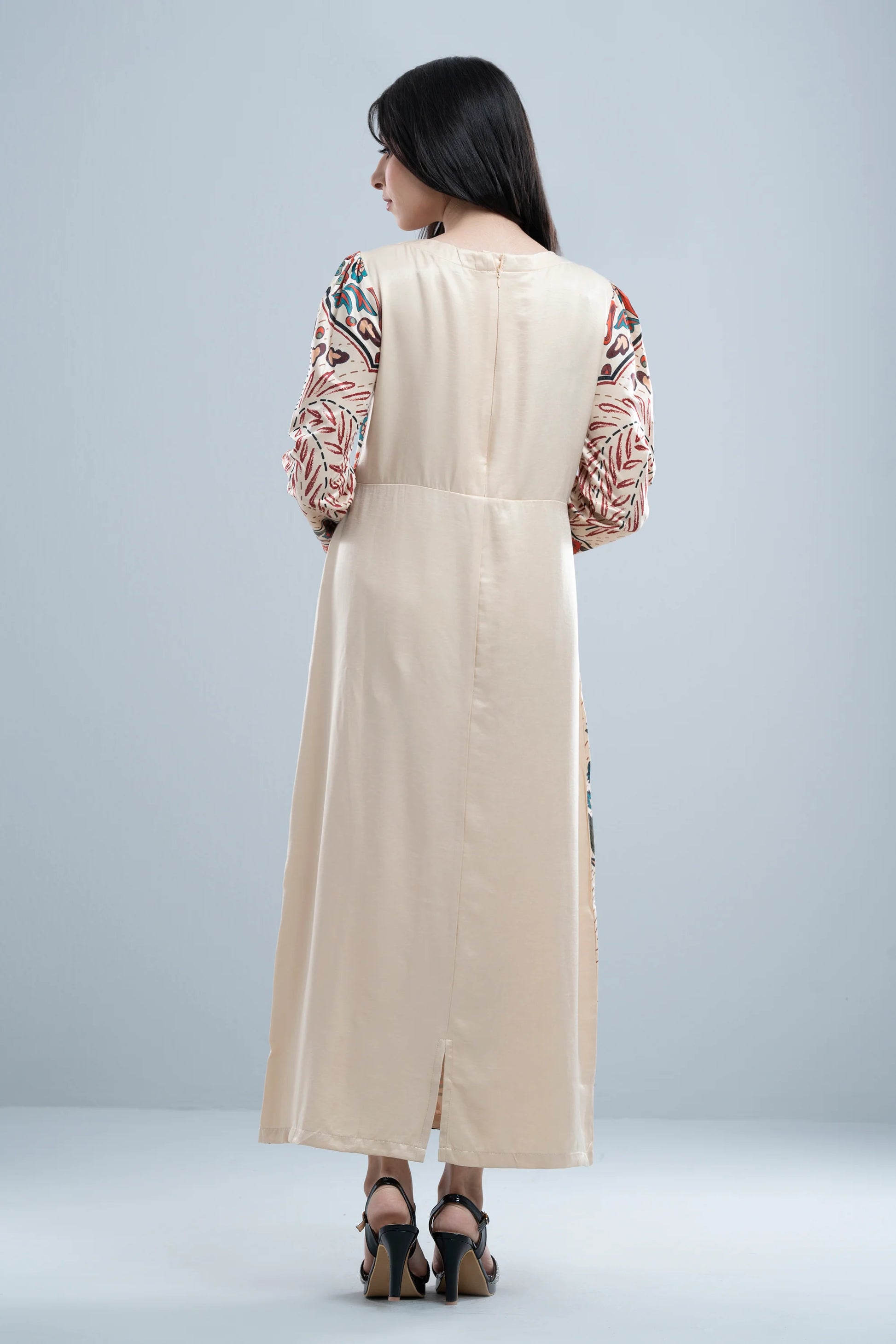 Step into vacation mode with this long dress, adorned in a bold digital tropical print that bursts with lush leaves and exotic blooms. Designed in a flattering A-line silhouette, it skims the body and flares gently for effortless movement. The ankle-length flow, regular fit, boat neck and full sleeves make it perfect for sunny escapes, resort dinners, or city strolls with a touch of island spirit.